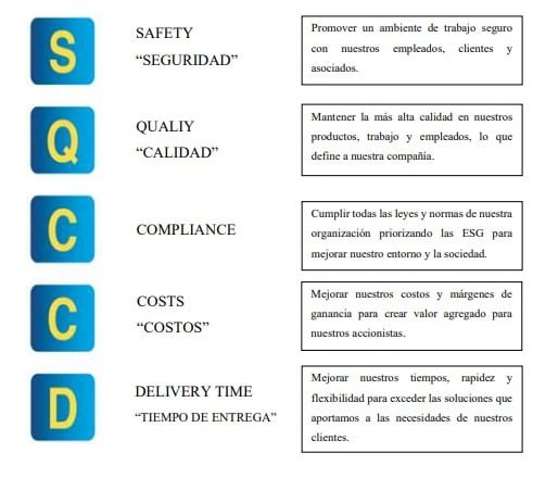 Además, promovemos un ambiente de trabajo seguro con nuestros empleados, clientes y asociados. Mantenemos la más alta calidad en nuestros productos, trabajo y empleados, lo que define a nuestra compañía. Cumplimos todas las leyes y normas de nuestra organización, priorizando las ESG para mejorar nuestro entorno y la sociedad. Mejoramos nuestros costos y márgenes de ganancia para crear valor agregado para nuestros accionistas. Mejoramos nuestros tiempos, rapidez y flexibilidad para superar las soluciones que aportamos a las necesidades de nuestros clientes.