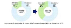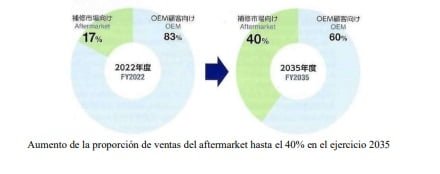 Aunque las ventas a clientes OEM han representado más del 80% de las ventas netas hasta la fecha, nuestro objetivo es crear una estructura corporativa menos susceptible al entorno externo, aumentando la proporción de ventas netas en al menos un 40% para el ejercicio 2035.